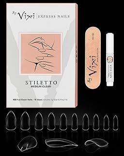By Vixi JEU D’ONGLES MOYEN STILETTO. COLLE ET LIME GRATUITES, 10 tailles, de faux ongles express à couverture complète Clair, une utilisation professionnelle en salon & à domicile (600 x Ongles)