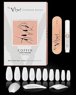 By Vixi JEU D’ONGLES LONG CERCUEIL/BALLERINE. COLLE ET LIME GRATUITES, 10 tailles de faux ongles express à couverture complète Opaque, professionnelle en salon & à domicile (500 x Ongles)